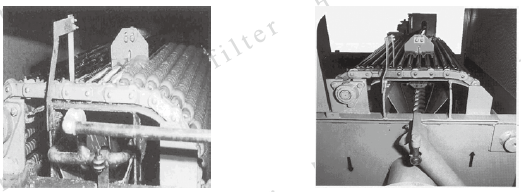SD-CMS型高效磁棒分离器主要由钢结构箱体、永磁棒组、链传动机构、自动清洁系统、自动输送排污系统和P L C控制系统组成。磁棒组浸没在待处理的液体中,液体流经磁棒和配水栅进入滤后液体腔,并流入储液箱中,液体中的亲磁颗粒在强磁场的作用下吸附在磁棒的表面,磁棒在电机的驱动下作缓慢的循环运动,充分吸附液体中的颗粒,当磁棒运动至顶部清洁部位时,位于设备顶部的清洁结构处于闭合状态并开始动作,将吸附在磁棒表面的杂质污物刮落,刮落的污物坠入下面的污泥槽中,污泥槽中设有输送机构将污泥排出至污泥箱中,完成一个刮除动作后,被刮除的磁棒已经清洁准备投入下一个吸附循环,清洁结构回到开启状态,以便后道的磁棒进入清洁部位,执行上述清洁动作。如此周而复始,循环分离和清洁,最终将液体中的铁粉颗粒充分的清除,完成本过滤器的工作目的。