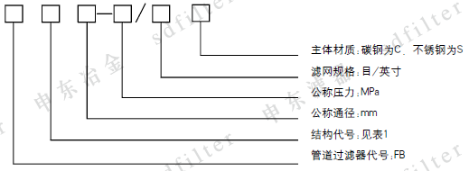 1、公称通径100mm、公称压力1.6MPa、滤网规格80目/英寸,主体材质为碳钢的角式直通管道过滤器,则标记为:FBYⅠ100-1.6/80C
