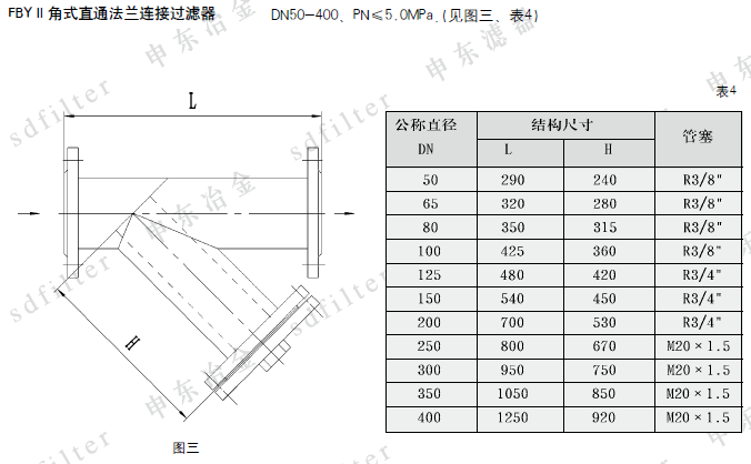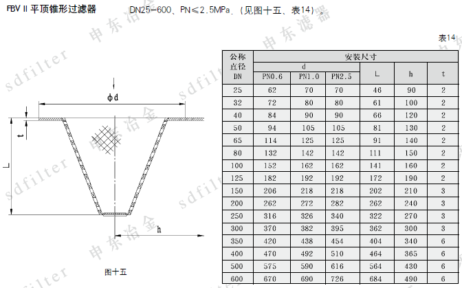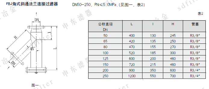 2、公称通径250、公称压力2.5MPa、滤网规格60目/英寸,主体材质为不锈钢的角式斜通管道过滤器,则标记为:FBJ250-2.5/60S