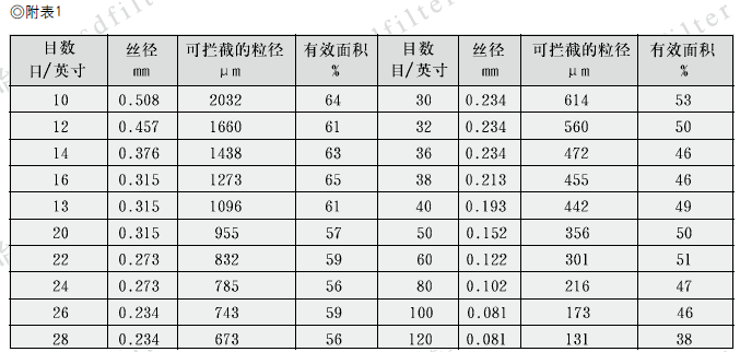 4、滤网材质除用户特殊要求外,一般采用ICr18Ni9Ti。滤网规格一般采用30目/英寸。当另有要求时,可按附表1选择其中的任何一种规格。