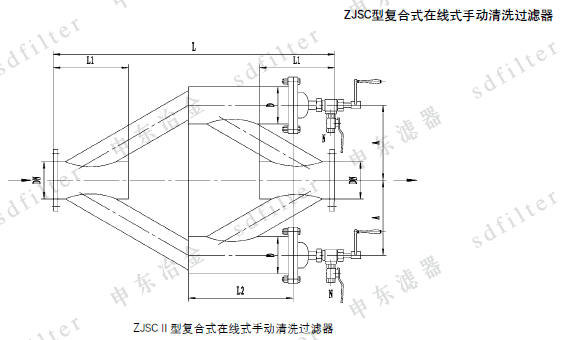 ZJS型在线式手动清洗过滤器可水平或垂直安装,安装时应注意外壳上箭头方向必须与水流方向一致。