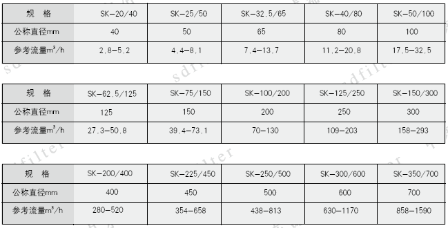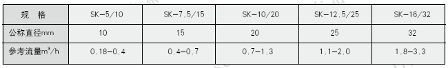 标准的SK型静态混合器其水力直径是混合器直径的1/2。即分隔号前的数字表示水力直径,分隔号后的数字表示公称直径。下面给出的是部分常用规格,表中所列参考流量是指普通粘度液体相混合时的流量,不适用于气体和高粘度液体。对气体、高粘度液体和气/液体系需另经专门的设计计算。