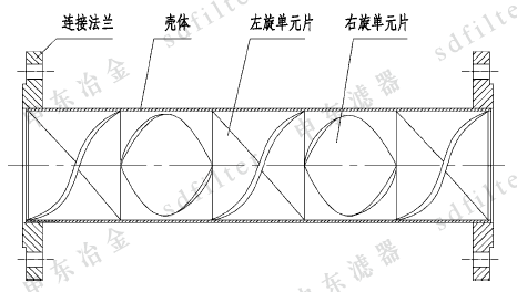 SK型静态混合器又称单螺旋形静态混合器,它的单元是扭转180°或270°的螺旋板,安装入管壳时相邻的螺旋板分别为左旋和右旋。与S V型静态混合器相比,S K型的混合效果较差,且有明显的放大效应,但是S K型不容易堵塞,适用于较脏的物料。用于乳化过程时能使液滴分散到10μ m,用于一般的混合过程不均匀度系数αX≤5%。