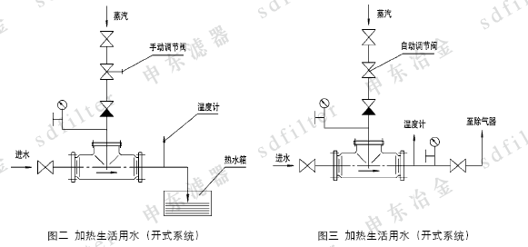 2、用于浴室加热热水送入水箱,代替热水箱中原高噪声、强振动的蒸汽直接加热方式(花管)。(图二)