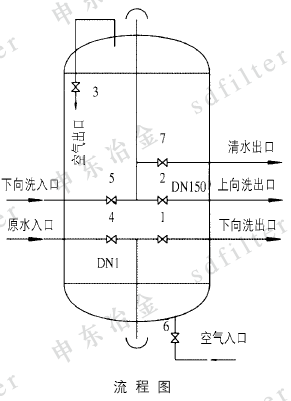 待出水水质符合要求时,先打开清水出口阀7.再关闭上向洗污水出口阀2.即进入正常运行(过滤)状态。