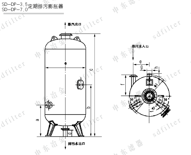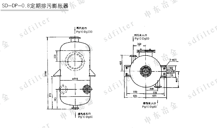 一、概 述 定期排污膨胀器是将锅炉定期排污水或压力比定期排污膨胀器更高的排出的废热水,经过减压、扩容分离出二次蒸汽和废热水。二次蒸汽排入大气或作为热源利用,废热水一般经排污降温池排入下水系统。 锅炉排污水具有和锅炉相同的工作压力及其压力下的饱和水温,在定期排膨胀器前设有节流阀降低压力,以便在定期排污膨胀器内扩容、降温,分离出二次蒸汽。