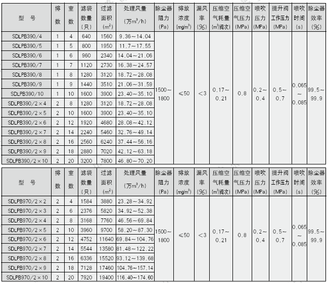 袋式除尘器的运行阻力受含尘气体的工况、滤料的选取、过滤风速的大小影响,过滤风速低其运行阻力一般也低,SDLPB型低压脉冲喷吹袋式除尘器运行阻力一般在800~2000Pa左右。