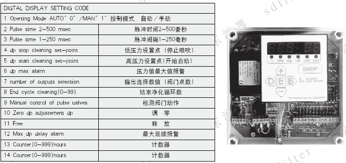 电子差压仪DP-M I NI分别连接在除尘器的清洁侧和污染侧,测量布袋之间的差压值。该装置显示连接的差压值并设定值输出至控制器。 电子差压仪DP-M I NI的主要组成部分是压阻传感器,该装置已被线性化,并带温度补赏,这种双重补赏的电路使电子差压仪DP-MINI成为现代化精密仪表,电子差压仪DP-MINI提供与除尘器连接的有关配件。