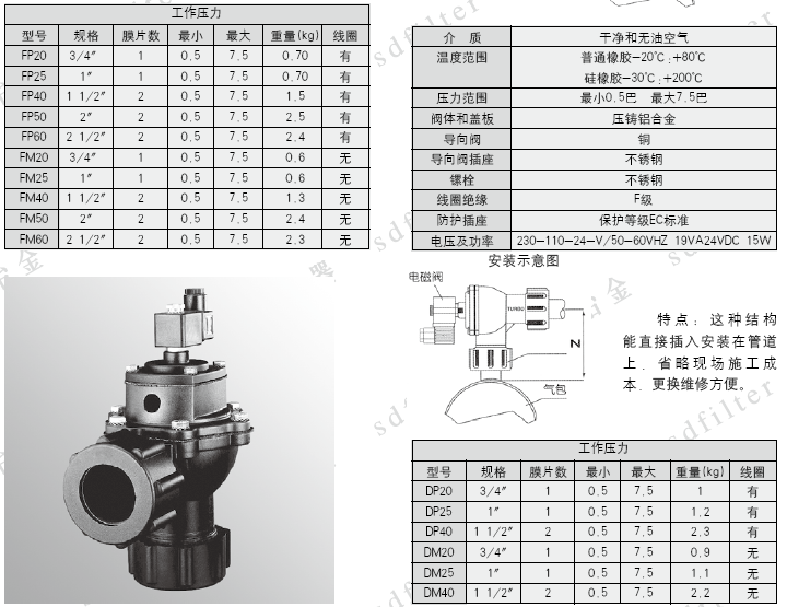 一、特 点 ◆ 模块式组件,易于拆装 ◆ 有两种型式可选,电磁头线圈直接控制式和电磁头分离遥控式 ◆ 口径3/4-1″电磁阀为单膜片阀,不需要弹簧 ◆ 口径1 1/2″以上电磁阀为双层膜片阀 ◆ 阀体角度为直角90℃,配置有特制膜片,为空气过滤器及除尘器提供高效冲喷吹效果 ◆ 特制膜片强度,适合于恶劣工况运行 ◆ 电磁头线圈可旋转360° ◆ 线圈低耗,符合国际电工IEC335标准 ◆ 可选装消声器,减少运行时噪声,安静工作 ◆ 膜片寿命超过300万次 ◆ 电磁线圈500万次